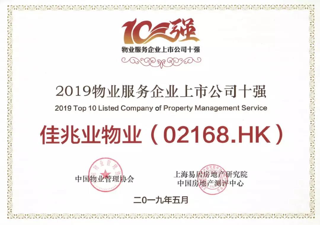 佳兆业物业荣获“2019物业服务企业上市公司10强”。