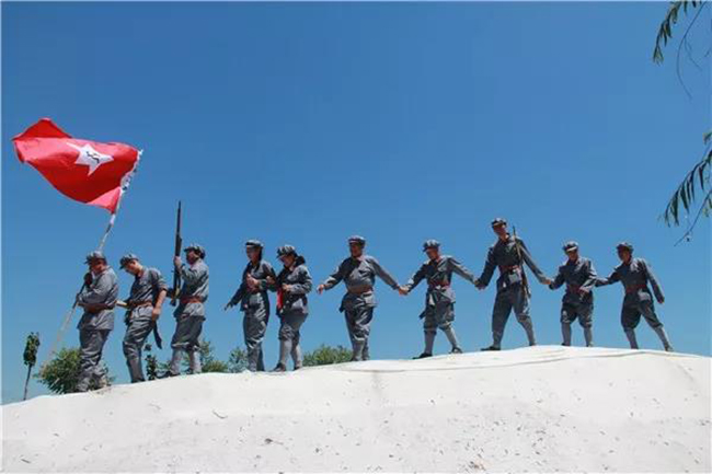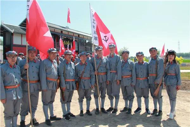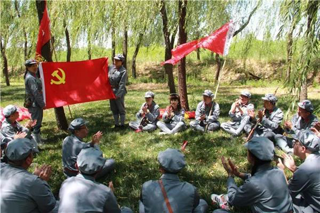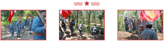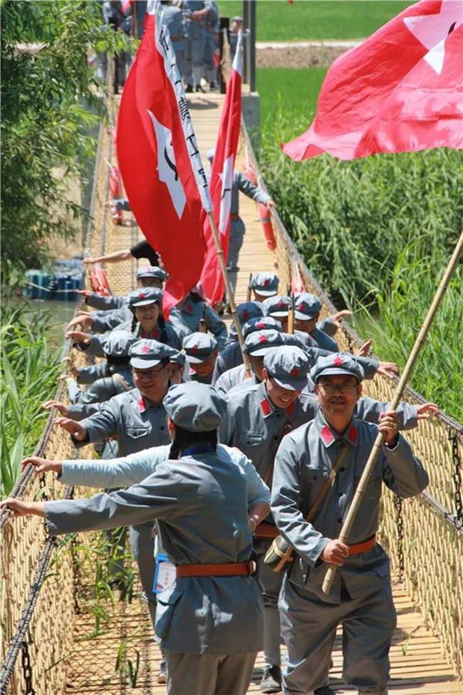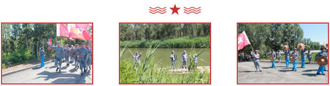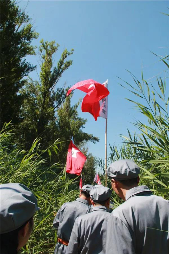 本次活动模拟了当年红军二万五千里长征的路线。先后穿过三道封锁线后,同志们行进在茂密的丛林里闯过芦苇荡,踏上古堤,随后村民文艺队为战士们演唱了《十送红军》,并送上了慰问品。大家走在广阔的田野上,听着湘江战役的历史,回顾着那段难忘的岁月。此时,湖边又想起了那熟悉的旋律,小小竹排,红星照我去战斗,把大家带入那个特殊的年代。在“遵义会议旧址”大家合影留念,记录这段难忘的岁月。