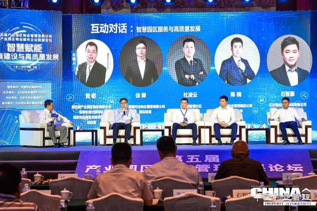 论坛进入互动对话环节。第四届产业园区物业服务企业联盟轮值主席单位、西安创业物业发展有限公司总经理贾砺主持,上海漕河泾物业管理有限公司副总经理徐卿,乐生活智慧社区服务集团股份有限公司副总裁杜凌云,金地物业管理集团公司副总经理陈楠,亿达物业服务集团有限公司副总经理