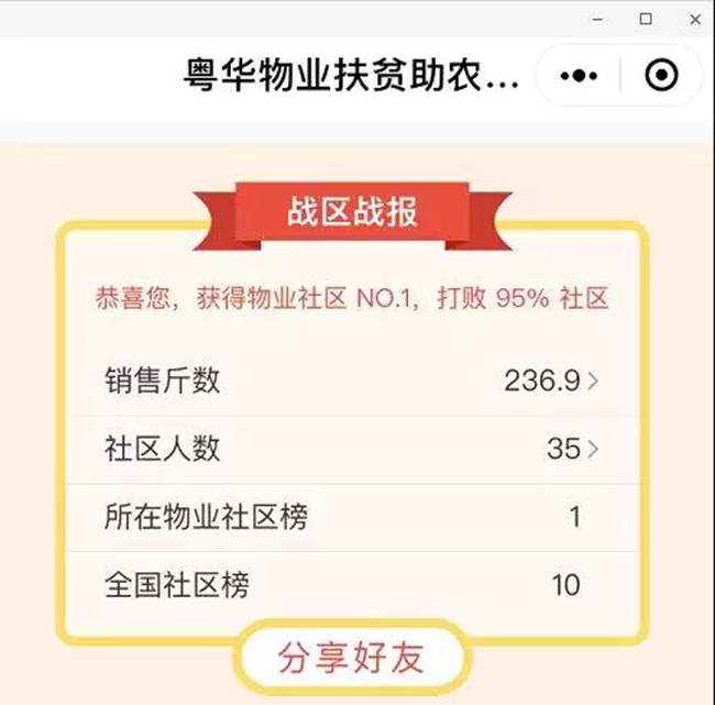 参会的党员和管理干部纷纷扫码关注,查看平台上滞销的农产品,并根据个人能力和需求,进行自愿选择性消费。动员大会上,由党员和管理干部带头帮扶和宣传,半小时以内,粤华物业扶贫助农专项工作,协助滞销农产品销售已达236.9斤,排名全国社区榜第10名,帮扶动员工作首战告捷。