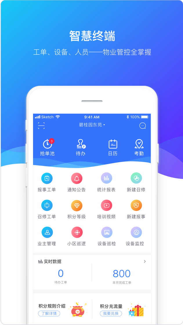 “碧邦”将传统的线下业务流程、信息放到移动端,简化业务流程、无纸化作业,实现数字化运营,让业务流程更高效、透明,并通过抢单激励提高人员效能,优化管理,降低成本,同时协同其后端实现设备信息数字化、巡检维保标准化、数据管理云端化等,为物业一线运营管理带来多方面助力: