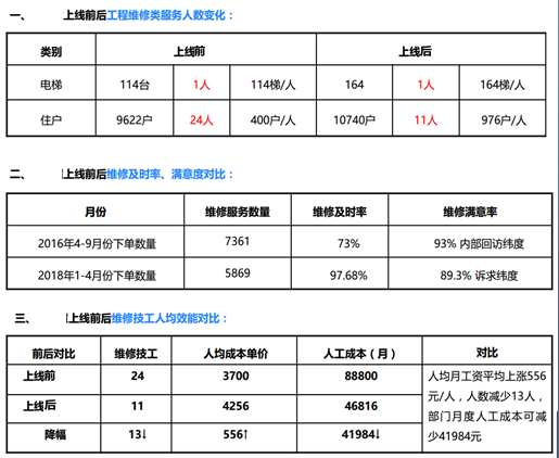 该项目通过碧邦,使报事业务流程形成闭环,实现高效运营,维修及时率从原73%提升至97.68%;抢单功能,多劳多得,一线维修人员的平均月薪上涨约556元/人,极大激励了人员工作积极性,与此同时淘汰了低效能人员,维修技工人数从原有24人减少为11人,部门月度人工成本约减少41984元。