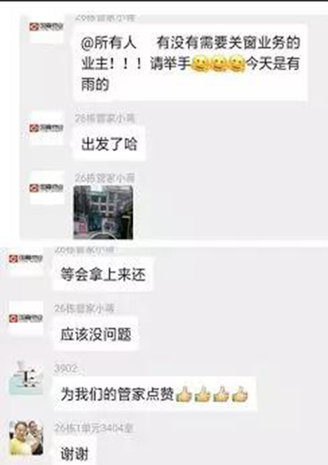天府逸家的客服管家主动为业主关窗。因市政管道原因,小区大厅遭遇返水,导致电梯停运。嘉宝服务人员爬上26楼帮助装修空置期业主关窗,下午3点才吃上午饭。