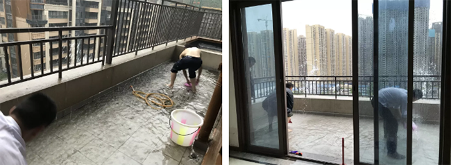 22日,暴雨来袭,业主家20平米的露天阳台大面积进水,短时间内积水超过10公分,威胁业主客厅。嘉宝客服人员一边关闭业主窗户,一边组织人力往外舀水。