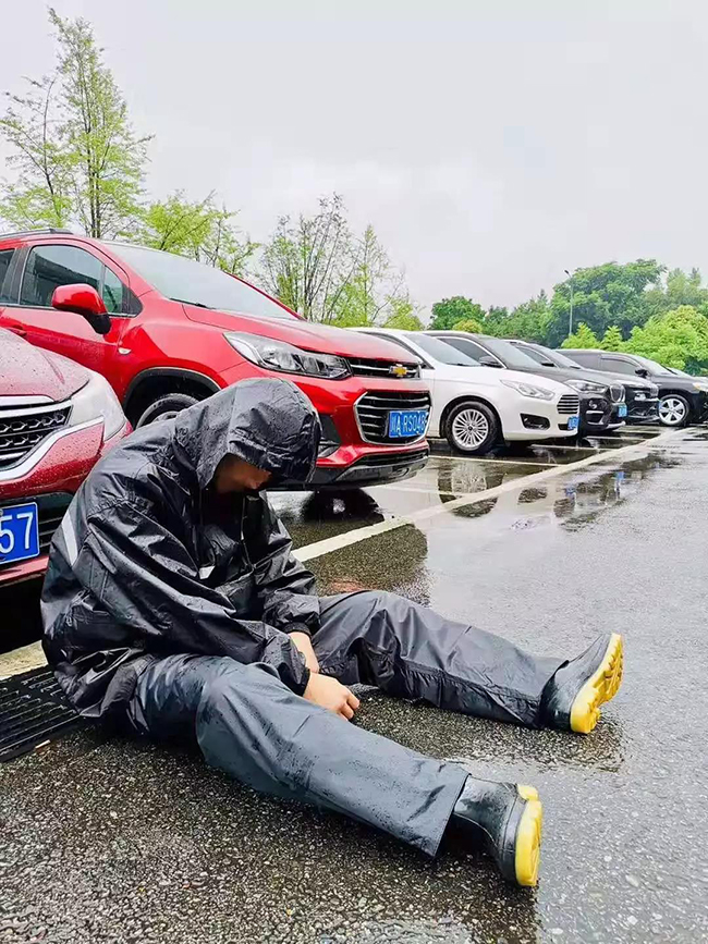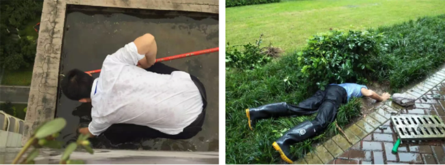 另一方面,针对淤泥堵塞问题,在汛期前1-2个月,嘉宝就开启了专项清淤工作,同时每周会对地下排水沟渠、楼顶排水口进行清掏。暴雨来袭,沙石俱下,对排水沟渠造成了堵塞,于是嘉宝服务团队徒手上阵,迅速解决堵塞问题。