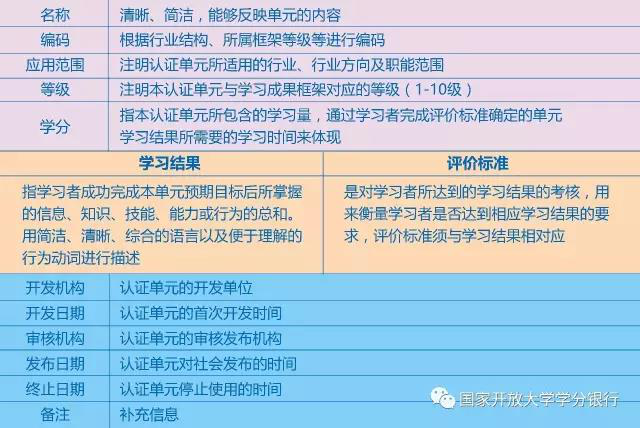 认证标准是学习成果实现认证、积累与转换的参照和依据,认证标准是通过一个个认证单元实现的。而认证单元是具有连贯而明确的学习结果和评价标准的内容模块。它是用于学习成果认证的最小单位,每一个认证单元都用通俗易懂的语言描述其对知识、技能和能力的要求。所有的认证单元都使用相同的模板进行描述,包括学习结果、评价标准、学分值及学习成果框架等级等要素。认证单元是认证标准的核心内容,依据认证单元,不同类型的学习成果可以得出科学、合理、有效的对应关系。