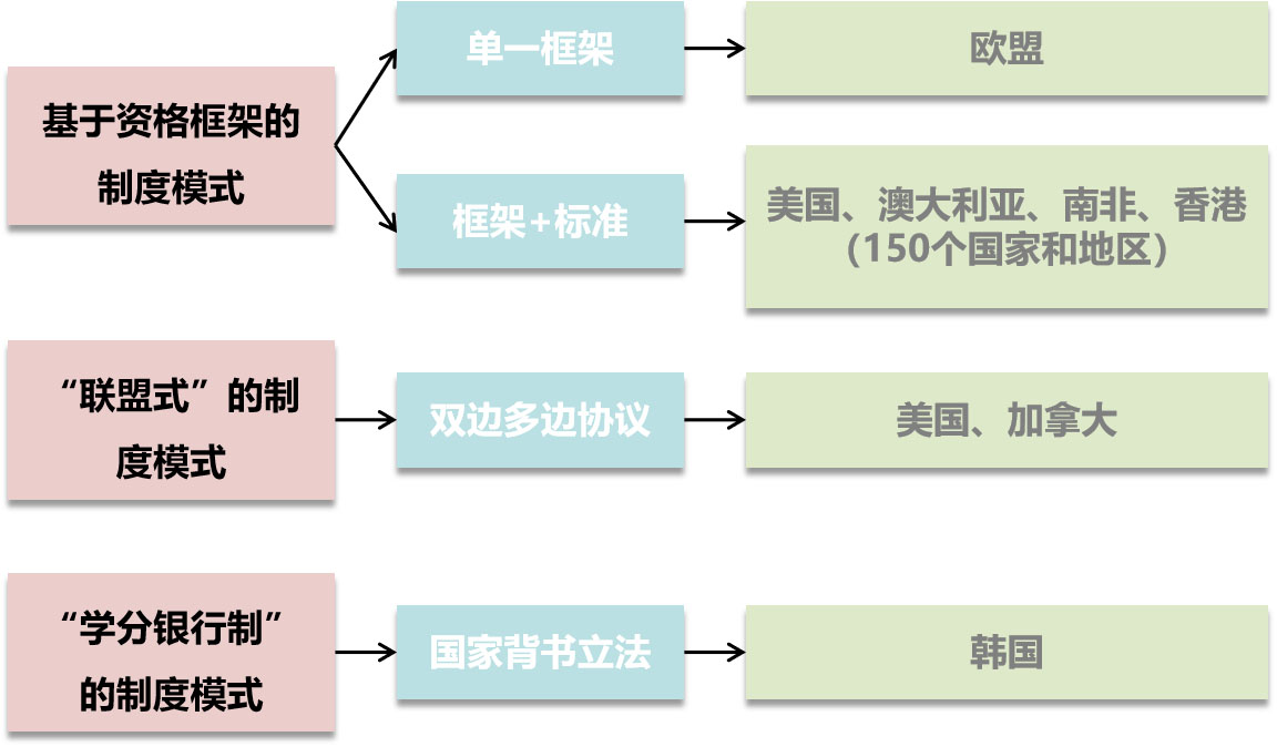 国际上,大约有150多个国家是通过“资历框架”的方式,作为各级各类学习成果的共同参照系,通过标准和规范,促进不同类型学习成果之间的沟通与衔接,实现学习成果的积累与转换。经过案例研究发现,国际上的“学分银行”制度模式主要有以下几种: