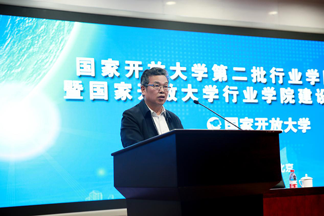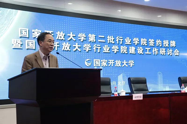 国家开放大学党委书记、校长杨志坚在会上发表讲话,他指出,国家开放大学在试点转型方面做出了许多探索,其中最重要的是持续吸纳企业和社会力量联合办学。早在2013年,国家开放大学就先行探索开设了第一批行业学院,在国家行业部门支持下,与中国煤炭工业协会、中国社会工作联合会等全国性行业组织合作成立了煤炭学院、社会工作学院等首批10家行业学院。2016年,与中国邮政集团公司合作成立了邮政学院。