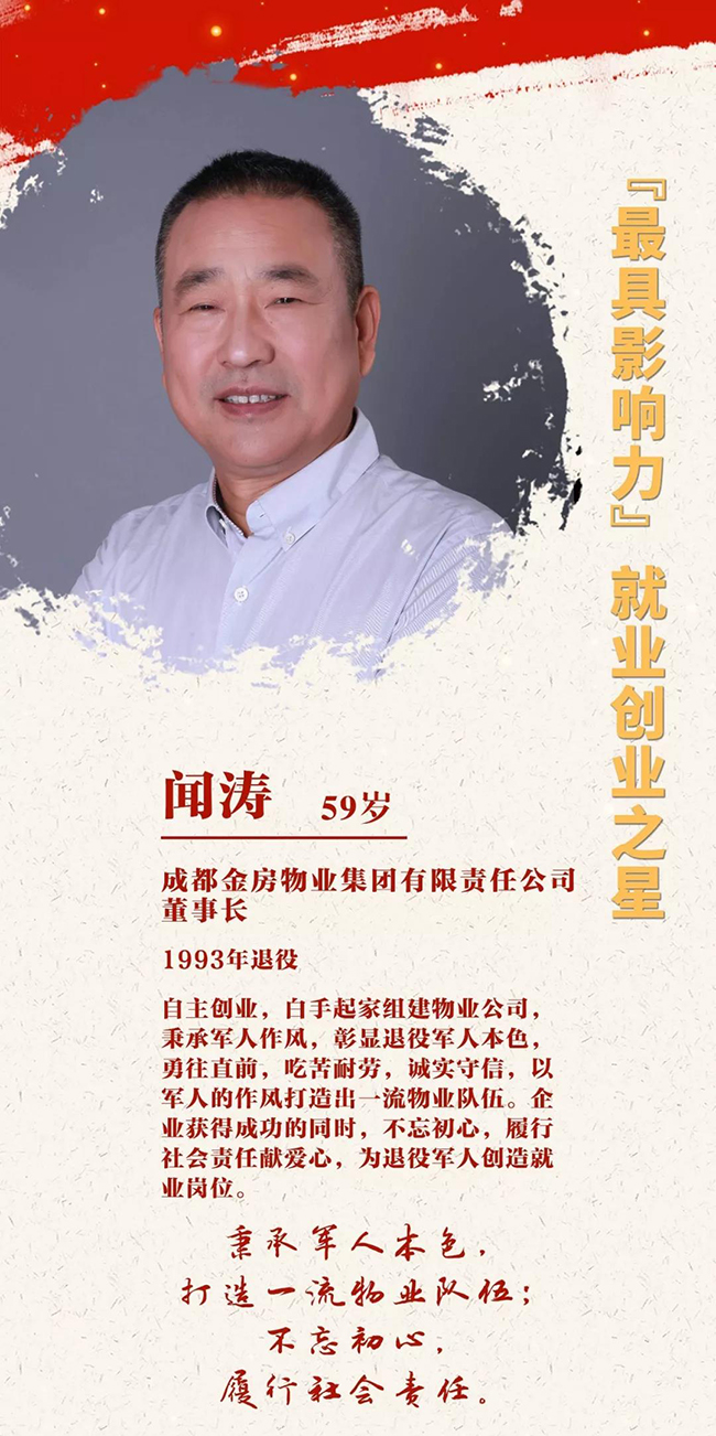 1993年,有着16年军旅生涯的闻涛同志从部队转业后,先是到政府部门工作,1998年辞去公职,毅然创业,白手起家创立了成都金房物业有限公司。秉承“退役不退志,退伍不褪色”的军人作风,用军人精神激励自己,彰显军人本色,勇往直前,吃苦耐劳,诚信踏实,以军人的作风打造了一支新队伍。公司创业20多年来,培养了一批又一批军人,勇于承担起安排解决退伍军人就业、创业的社会责任。目前,金房物业已吸纳退伍士兵800多名,15名退役军人担任分公司负责人,130名退役军人担任项目负责人,集团总部一半是退伍军人,这些军人成为企业发展的脊梁。