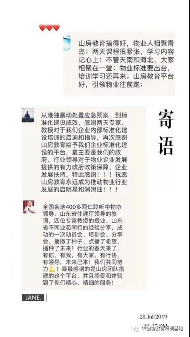山房教育作为今年山东省房地产业协会物业管理行业分会当值会长单位,将紧密围绕落实中国物协和山东省“标准建设年”的主题开展工作。坚持党建引领,着力实现党建工作与行业、企业发展协同推进;持续推进标准建设工作,进一步提高物业企业标准意识,助力服务质量提升;响应中国物协的号召开展精准扶贫工作,积极为精准扶贫工作贡献行业力量。山房教育将不负众望,继续为行业搭建优秀企业和人才,交流互通、共享共进的立体式学习平台,携手广大物业企业共同努力,为物业行业的发展不懈努力!