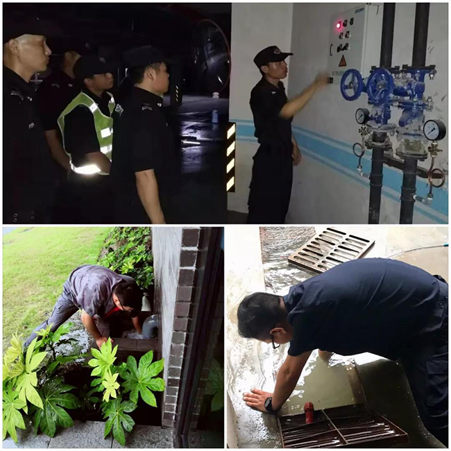 随着风雨断断续续来临,台风的威力逐渐显现,物业人对道路及园区安全情况重点监控,对排水系统实时检查。