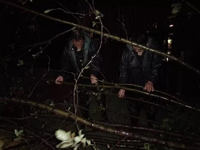 天色愈暗,嘉善地区出现强降雨情况,道路开阔区域的树木及围栏出现倒伏状况,物业的抗台战士们冒着风雨,对损坏的围栏、树苗进行清理转移。