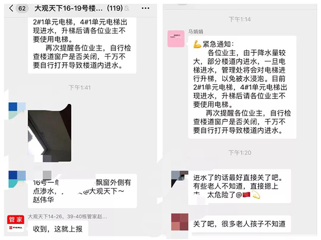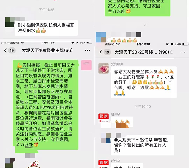 “我家楼顶空调外机有晃动的声音……晚上20时求助后,刘师傅和纪管家冒着大雨爬上楼梯帮我固定好了,下来的时候衣服都淋湿了。在此,我诚挚地感谢他们!”