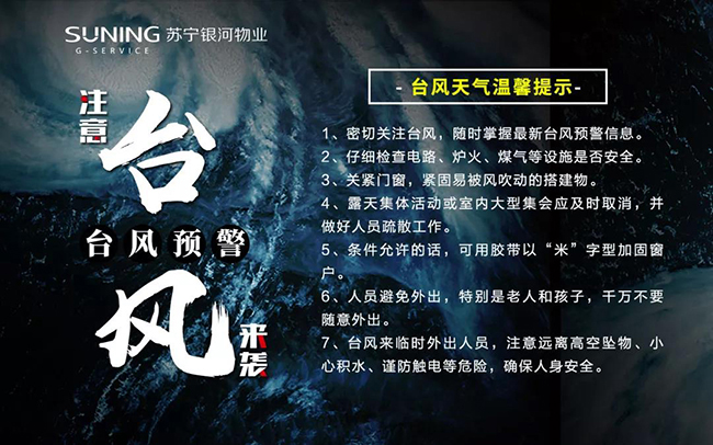 台风影响仍在持续,苏宁银河物业温馨提示广大业主,台风天危险多,请不要在户外逗留,尽早回家,以免遭遇大雨大风。大雨天请尽量不要开车出行,如果遇到紧急事情,外出请带上雨具,关好门窗,尽量避免涉水。台风期间,苏宁银河物业人严阵以待,如有需要请及时联系物业服务中心。