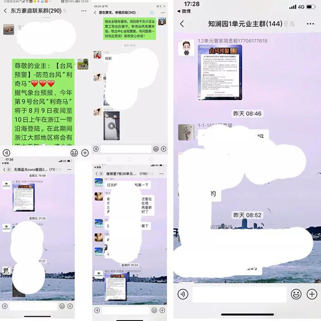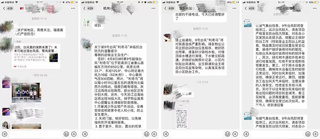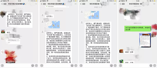 区域总部职能在接收到“利奇马”的消息后第一时间在主要管理群及员工群发布台风预警信息,告知台风严重性,各片区、城市、项目迅速进入一级备战状态,各项目通知业主台风事宜。