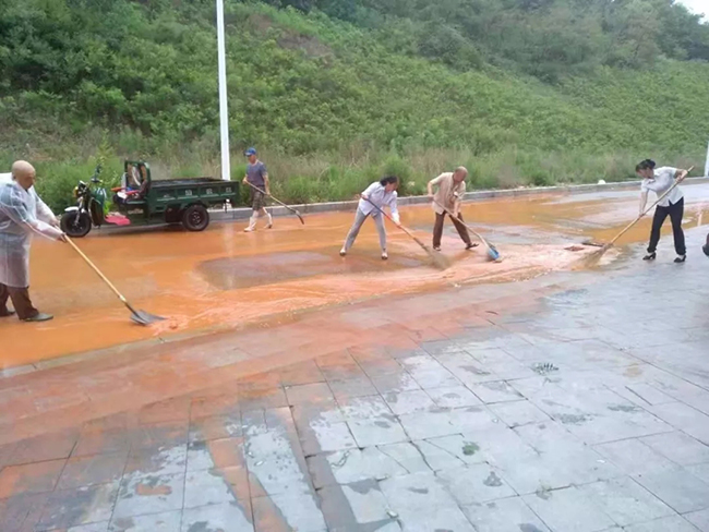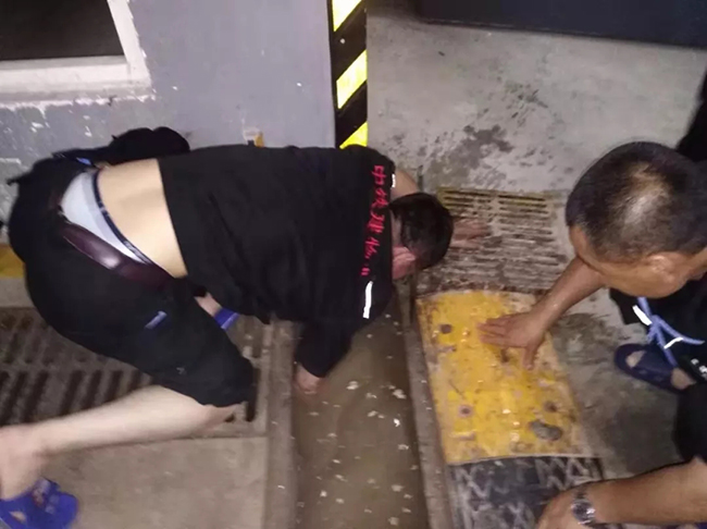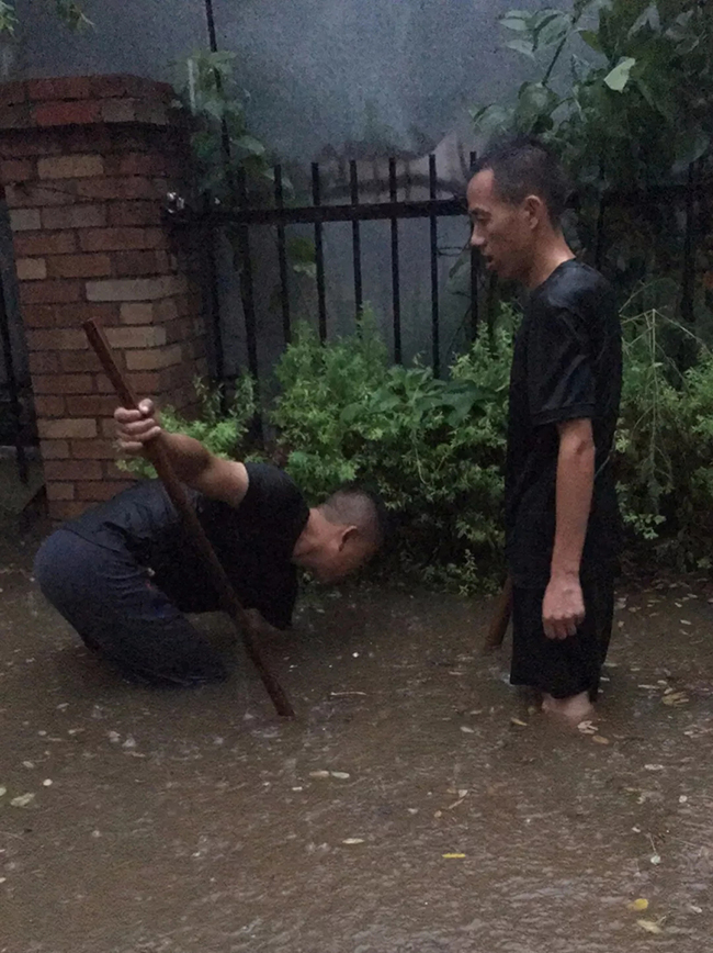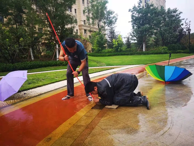天色已近黄昏,雨势未见减弱,园区和道路开始出现积水现象,物业人加快了脚步。