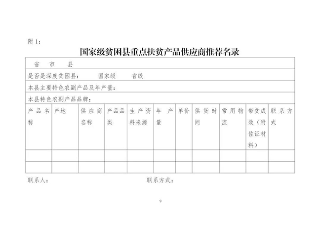 2019年9月15日前,各省级扶贫部门将本地区贫困县填写的《贫困县重点扶贫产品供应商推荐名录》(附1)和审核认定后的《贫困县重点扶贫产品供应商建议名录》(附2)报国务院扶贫办汇总。