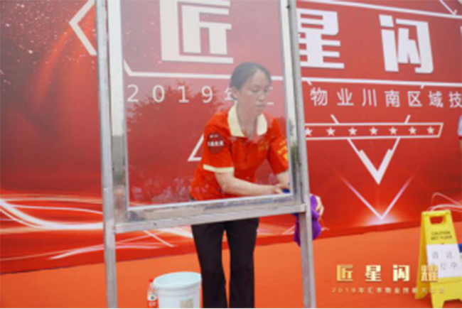 保洁技能比赛的选手们有条不紊的进行玻璃幕墙擦洗工作,步骤清晰操作灵活,在她们的一双巧手下幕墙焕然一新。