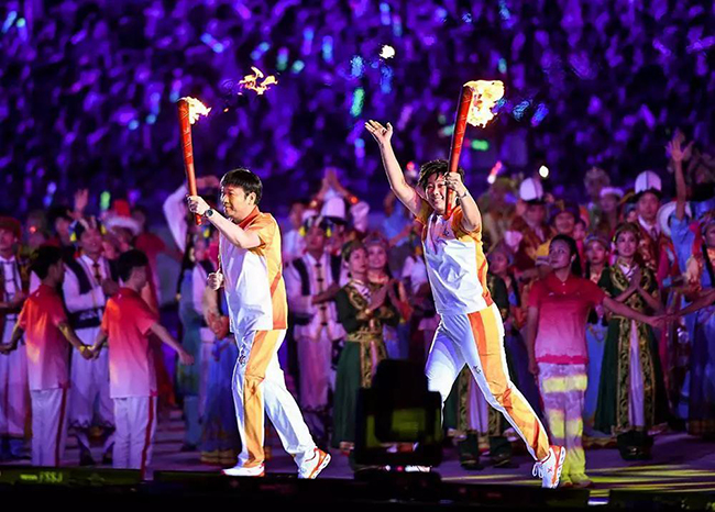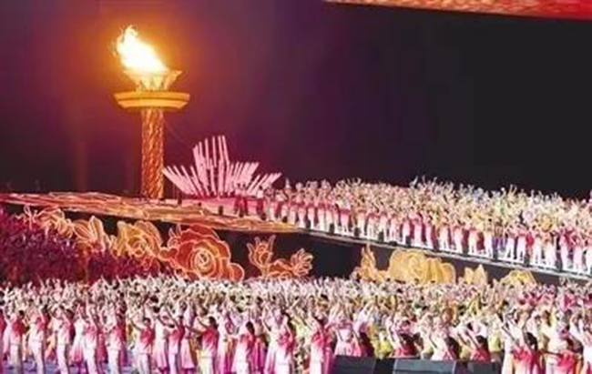 点火仪式把当天的开幕式推向高潮,吉祥物“中中”沿着“幸福之路”高举火炬进入现场,依次传递后点亮56个花瓣组成的“同心花蕊”,最终,象征着全国各族人民共同团结奋斗、共同繁荣发展的主火炬越燃越旺,56个民族守望相助、携手奋进的民族情越结越深。