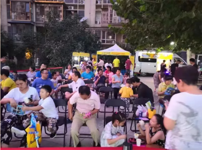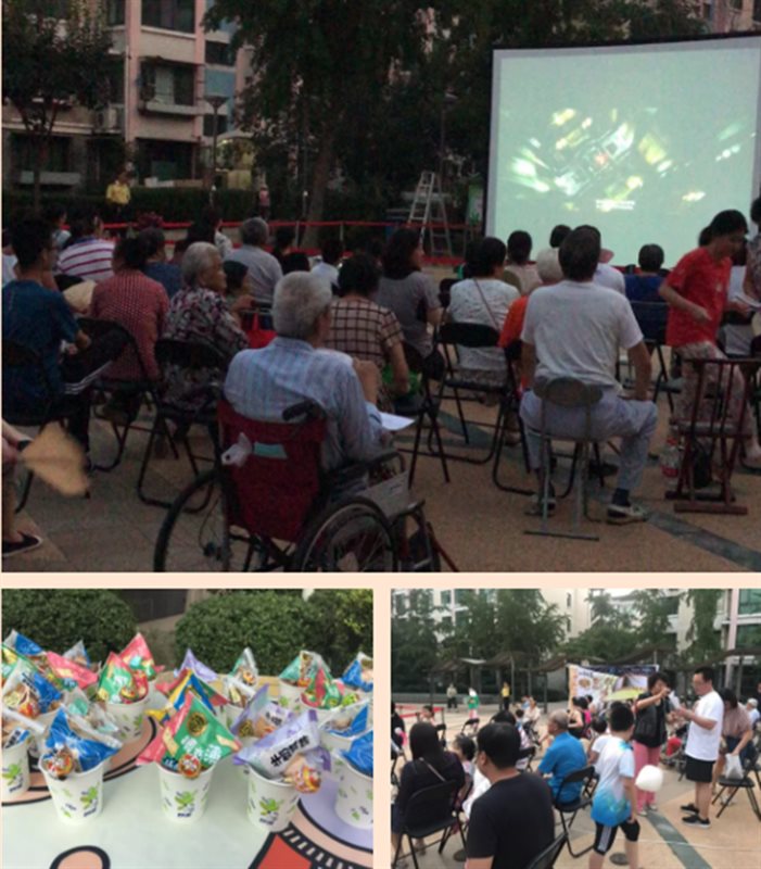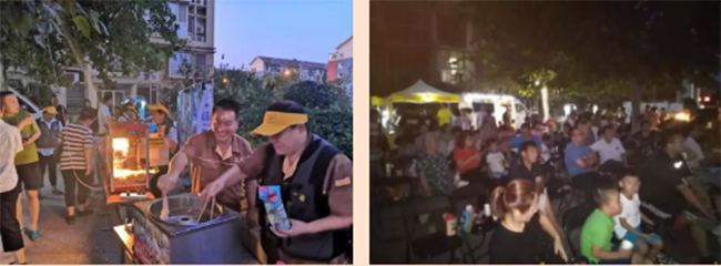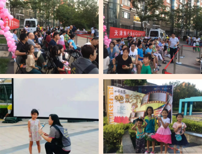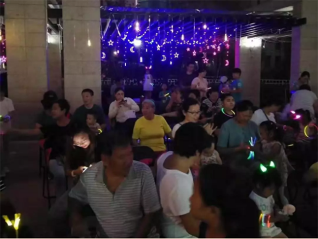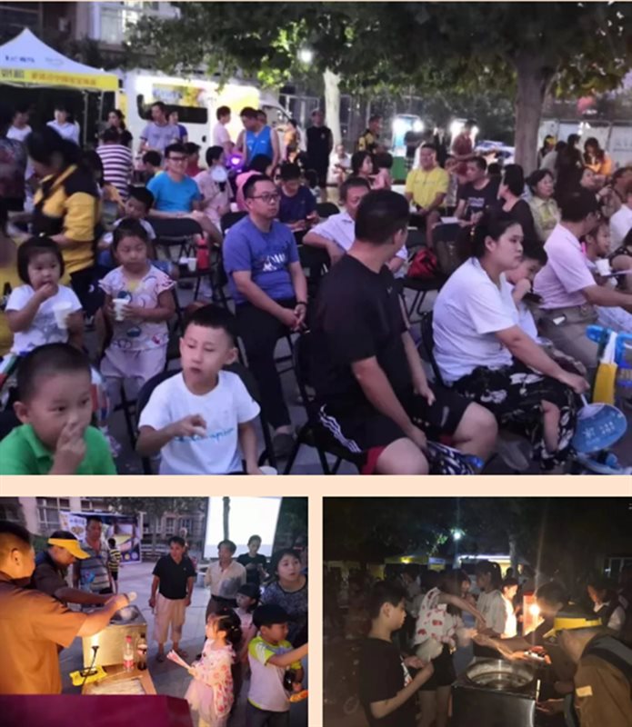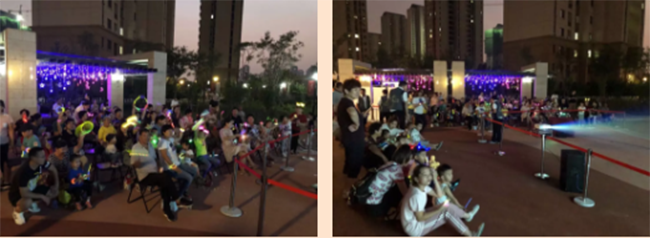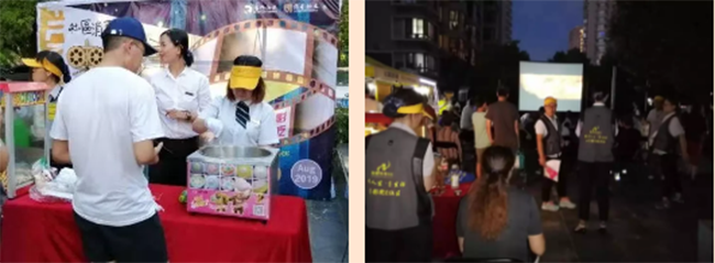 影片开始前,许多业主纷纷前来咨询便民服务、领取礼品和零食,每位物业人都在耐心的为各位业主解答,并不间断的为到来的业主提供优质的服务,影片开始放映,大家便纷纷坐在小凳子上观看电影,场面十分温馨。