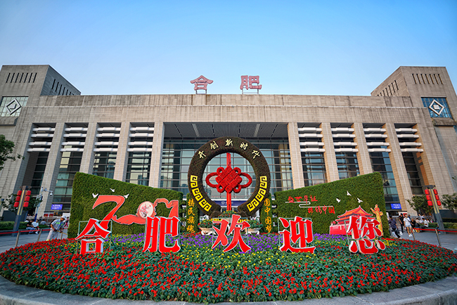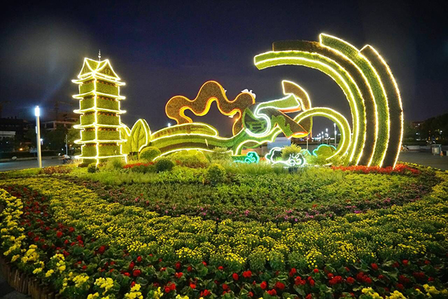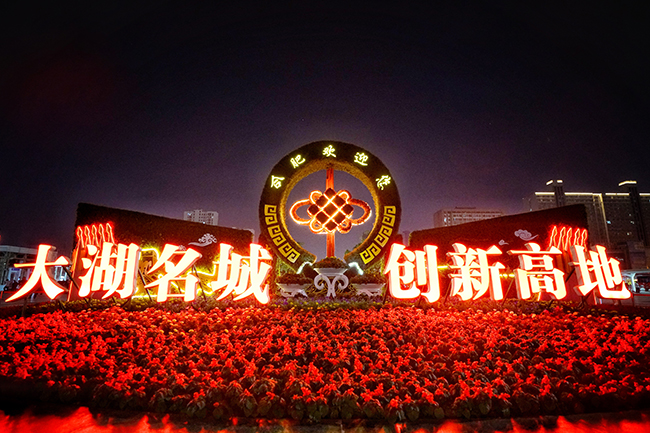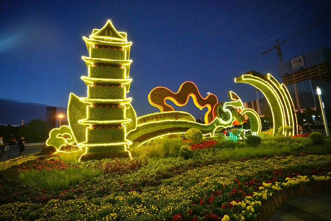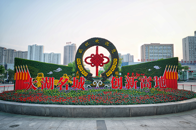 在合肥高铁南站、火车站、合柴1972、罍街等项目,通过大型立体绿雕展示、摆放各类花卉造型和常绿植物,营造出欢乐喜庆的节日氛围,引来众多游客驻足拍照留影。为了能够夜晚欣赏,在部分主体绿雕的外轮廓配以灯带,增加亮化效果。这次国庆花展,合肥湖滨物业管理有限公司融入安徽具有代表性的大量元素,立足丰富多彩、提升景观品质,通过工艺及艺术手法,运用科技手段,紧紧围绕“创新、协调、绿色、开放、共享”的发展理念,将花卉、绿植、园林摆件等以球状、柱式、立体式等多种形式组合,把70造型LOGO融入此次花展整体框架的设计构思和寓意中,打造色彩鲜艳、科技特色、寓意美好的花境景观,提升人民群众获得感、幸福感。