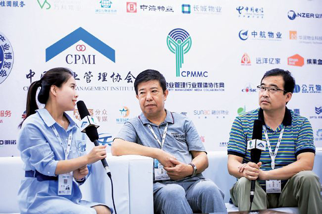 太原物协会长李朝平(中)、秘书长纪木春(右)在国际物业管理产业博览会上接受采访
