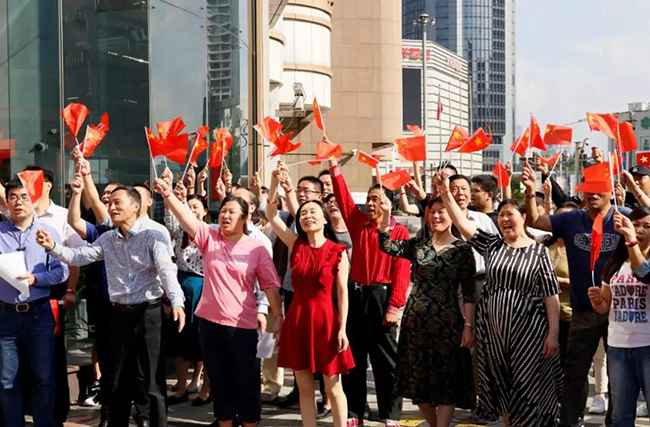 上实大厦管理处经理、楼宇联合党支部经理胡艺告诉记者,此次“快闪”活动,是上实大厦楼宇党支部开展的“不忘初心、牢记使命”主题教育活动的一项,旨在激励楼内党员和白领的爱国热情,大力弘扬爱国精神,唱响爱党爱国的主旋律。