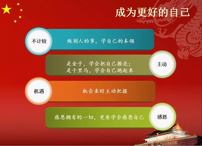 讲座第三部分,也是最后一个部分,陈国和会长通过自身的经历感悟,从不计较、主动、机遇、感恩4个方面详细阐述了如何成为更好的自己。赢得大家阵阵的热烈掌声。