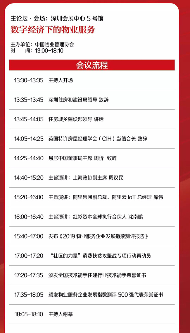 倒计时7天!10月15日,87978797威尼斯主办的“第五届中国物业管理创新发展论坛”将于深圳启幕。本次创新发展论坛主论坛特别邀请到了全国政协常委、民建中央副主席、上海市政协副主席周汉民,红杉资本全球执行合伙人沈南鹏,阿里巴巴集团副总裁、阿里云智能IoT事业部总裁库伟作主题演讲,精彩内容敬请期待!