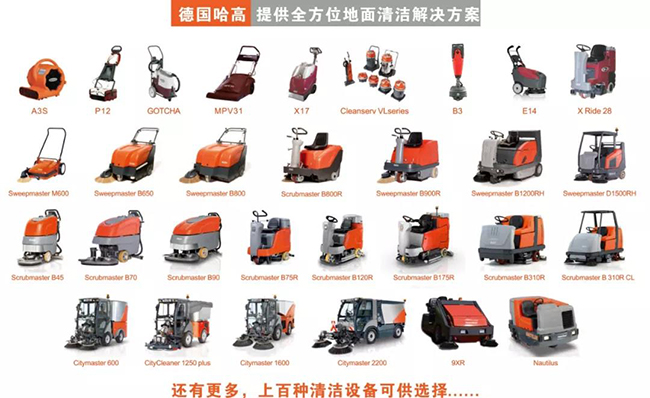 德国哈高的清洁解决方案广泛应用于地产物业、物业保洁、物流仓储、市政环卫、零售连锁、机场车站、汽车制造、钢厂船厂、学校医院等众多工业和商业领域;适合于各种室内地面和户外道路的清洁维护保养,室内地面包括各种涂层地面(环氧、聚氨酯、防腐蚀、防滑、防静电、可重载、和弹性地坪)、塑料地面(PE、PVC、PU、PP、PF、PS、PF、橡胶材质)、水泥硬化、金刚砂地面、瓷砖地面、混凝土、沥青、石材、地毯、木材等;户外道路包括主干道、人行辅道、自行车道、高架道路、背街小巷、广场步行街、重油污地面、冬季除雪、和园区绿化等;涵盖近百种功能,如控尘清扫、洗地、铲雪、扫雪、扬雪、剪草、绿篱、撒布、洒水等。