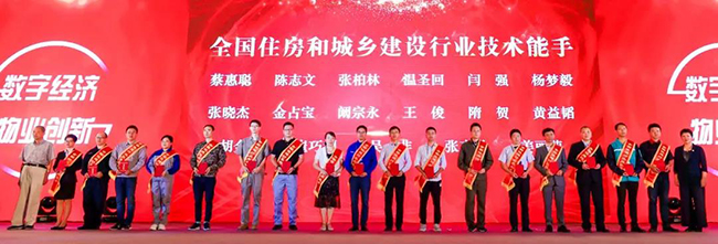 住房和城乡建设部房地产市场监管司物业服务市场监管处处长陈勇、中国物协副会长王鹏为“全国住房和城乡建设行业的技术能手”颁发荣誉证书