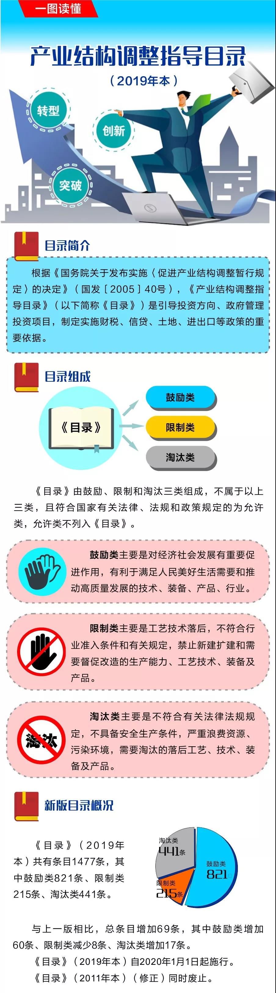 近日,国家发展改革委修订发布了《产业结构调整指导目录(2019年本)》(以下简称《目录(2019年本)》)。《目录》是引导投资方向、政府管理投资项目,制定实施财税、信贷、土地、进出口等政策的重要依据。《目录》由鼓励、限制和淘汰三类组成。