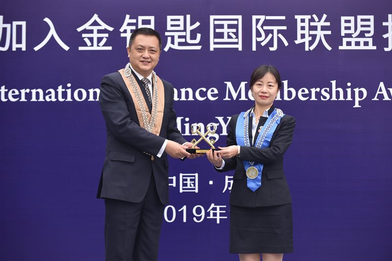 仪式伊始,在金钥匙国际联盟总部代表宣读联盟决定后,由联盟运营官张涛为李艳书记进行颁证、授牌、授勋带、佩戴金钥匙国际联盟标识、授旗,并对新会员的加入表示了热烈的欢迎。联盟培训顾问总负责人吴兆昌授予了李艳书记“金钥匙总经理会员勋章”。随后,中国金钥匙四川地区发展委员会副秘书长舒琳、方志庆为精神抖擞的洺悦府物业服务团队代表们佩戴上了联盟徽章,标志着洺悦府物业服务团队正式加入金钥匙国际联盟大家庭。