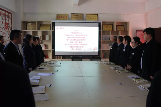 会议伊始,大家齐唱国歌,回顾党的艰辛苦难。使命担当,不忘中国精神。