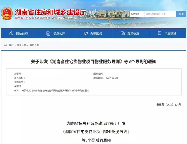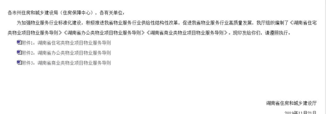 近日,湖南省住房和城乡建设厅印发了《湖南省住宅类物业项目物业服务导则》《湖南省办公类物业项目物业服务导则》《湖南省商业类物业项目物业服务导则》3 个导则。