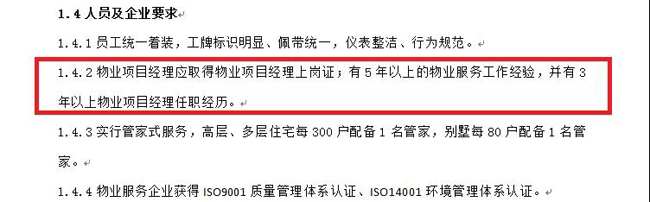 同时,物业项目经理应取得物业项目经理上岗证,有5年以上的物业服务工作经验,并有3年以上物业项目经理任职经历。如实行管家式服务,则高层、多层住宅每300户配备1名管家,别墅每80户配备1名管家。(下图)