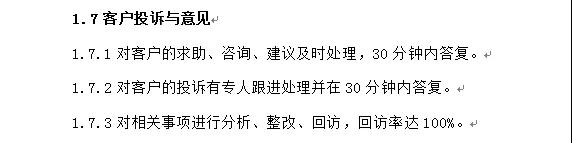 如遇到报修等情况,急修服务需在10分钟内到达现场,及时处理,一般维修服务4小时内完成(预约除外)。而对于客户的求助、咨询、建议应及时处理,30分钟内答复。对投诉要有专人跟进处理并在30分钟内答复,对相关事项进行分析、整改、回访,回访率达100%。(下图)