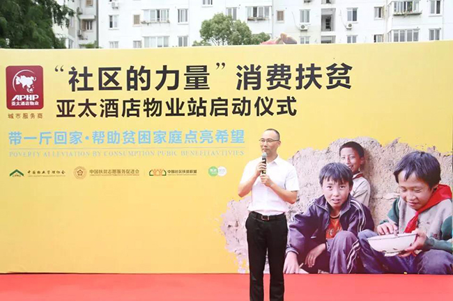 亚太酒店物业党委书记、董事长周朝辉发表了热情洋溢的讲话,他表示,作为中国扶贫联盟理事单位,浙江省文明单位,亚太酒店物业成立25年来,一直热心于公益事业。“让贫困地区优质的农产品从产地直接到餐桌,为市民带来健康绿色食品的同时,既是推广了贫困县域优质农产品,更是为扶贫攻坚贡献了一份力量。微小的力量也是一种支持,涓涓细流必将汇聚成爱的海洋。”