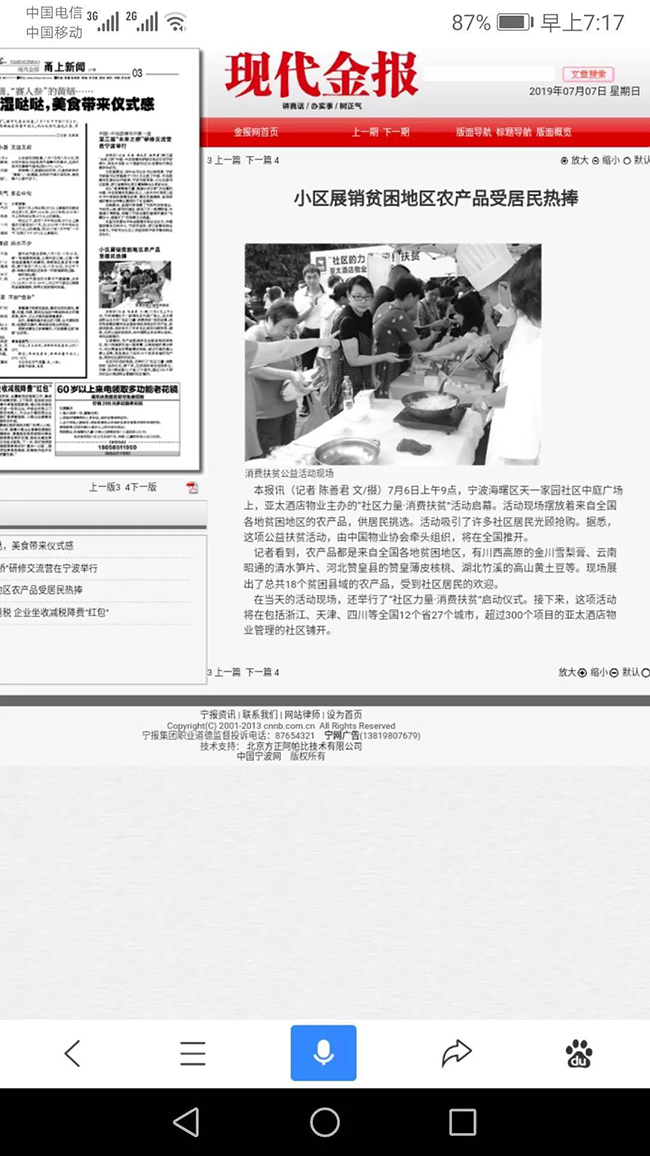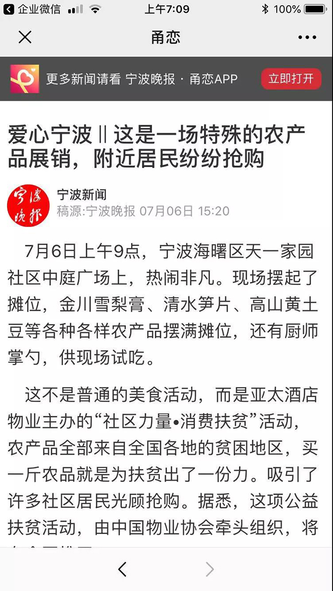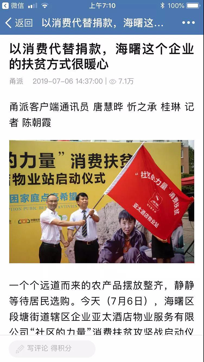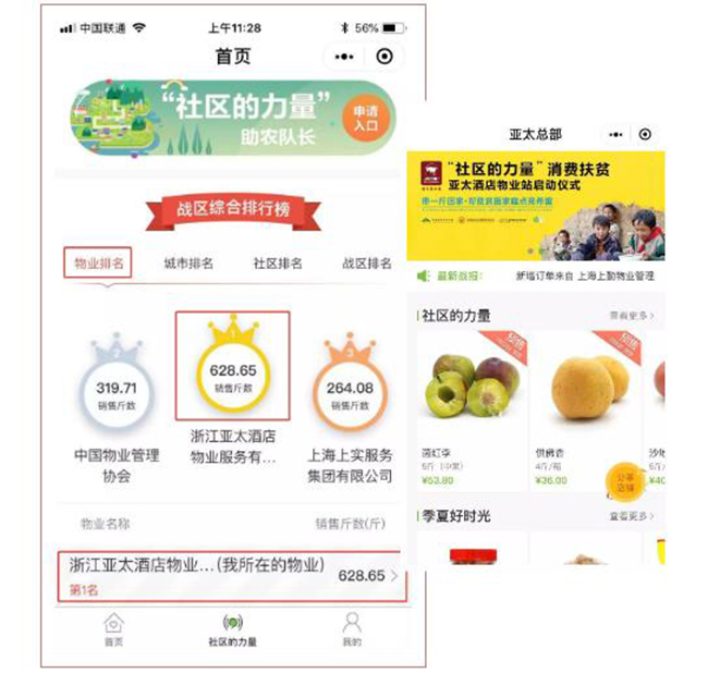 截止目前,亚太酒店物业累计线上销售扶贫产品628.65斤,位居扶贫战区综合排行榜物业企业第一位。后续亚太全国各个分子公司将同步启动消费扶贫活动,范围覆盖12个省27个城市300多个项目,直接打通贫困地区农产品与社区业主的购销渠道。