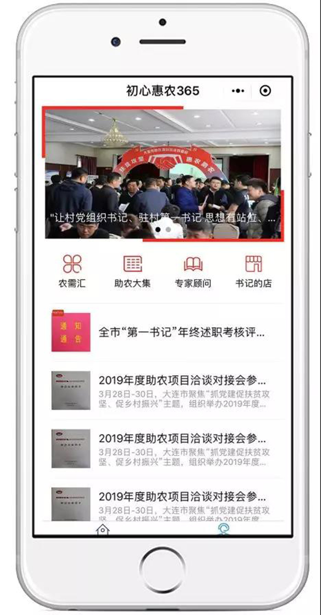 “初心惠农365”是大连市委组织部推出的网络对接平台,为社会资源与农村需求的对接提供了纽带,为广大社会力量助农、富农搭建了桥梁,通过手机小程序即可详细了解我市驻村第一书记振兴乡村的工作近况,还可以到书记的店中采购喜欢的土特产。