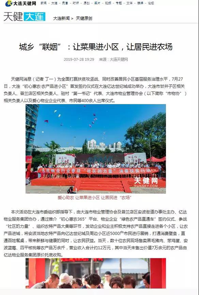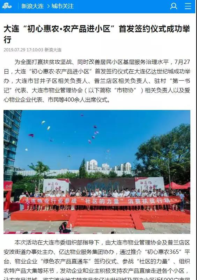 为全面打赢扶贫攻坚战、同时改善居民小区基层服务治理水平,727日,大连初心惠农·农产品进小区首发签约仪式在大连亿达世纪城成功举办,大连市甘井子区相关负责人、普兰店区相关负责人、驻村第一书记代表、大连市物业管理协会(以下简称市物协)相关负责人以及爱心物业企业代表、市民等2000余人出席活动。