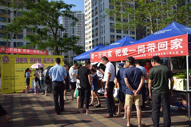 时值我国第二个“中国农民丰收节”,春种秋收,秋天的累累硕果是广大农民和农业战线工作者辛勤劳作的成果。为帮助贫困农民辛勤耕种的农作物得以销售,2019年9月22日,由中共龙城物业党委、中共龙城物业第三党支部、龙城物业组织举办的以“迎国庆 助扶贫 促和谐”为主题的“社区的力量”消费扶贫活动在龙悦居三期广场热烈举办。