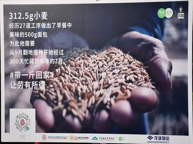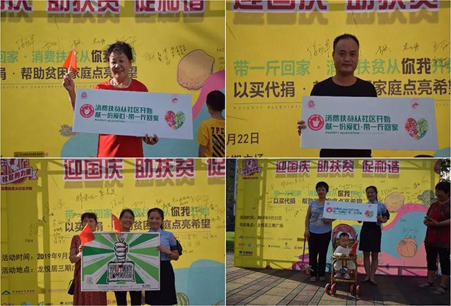 这些平常生活中所需的大米、红米、酱油、木耳、土豆片、水果等食材吸引着业主们的眼球,在龙城物业工作人员的指引下,业主们纷纷上前咨询如何扫二维码关注小程序“乐农社”、如何在“乐农社”平台下单购买扶贫产品。有不少家长带着孩子来了解扶贫活动,并带领孩子在签名墙上签上自己的名字参与扶贫活动。