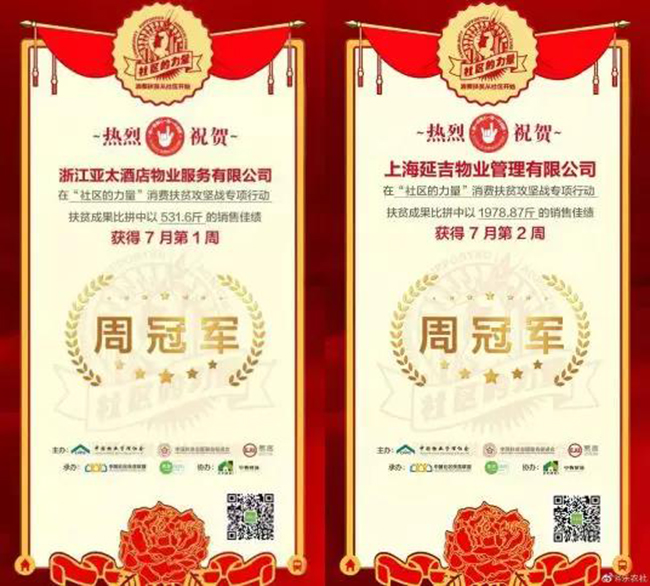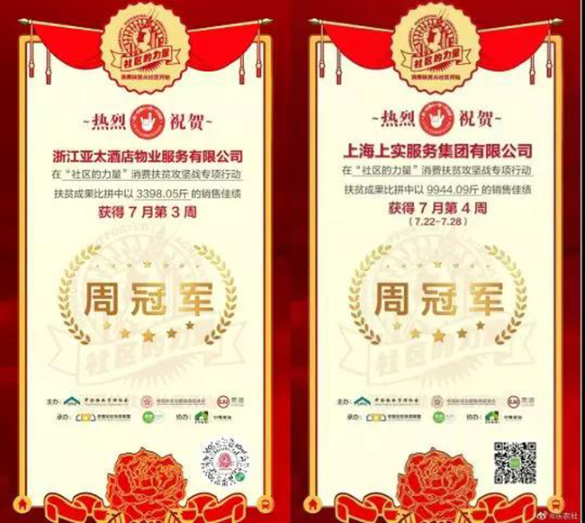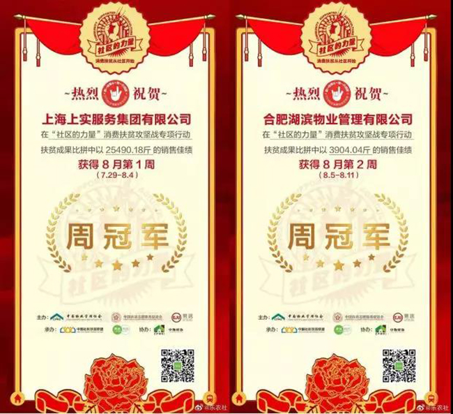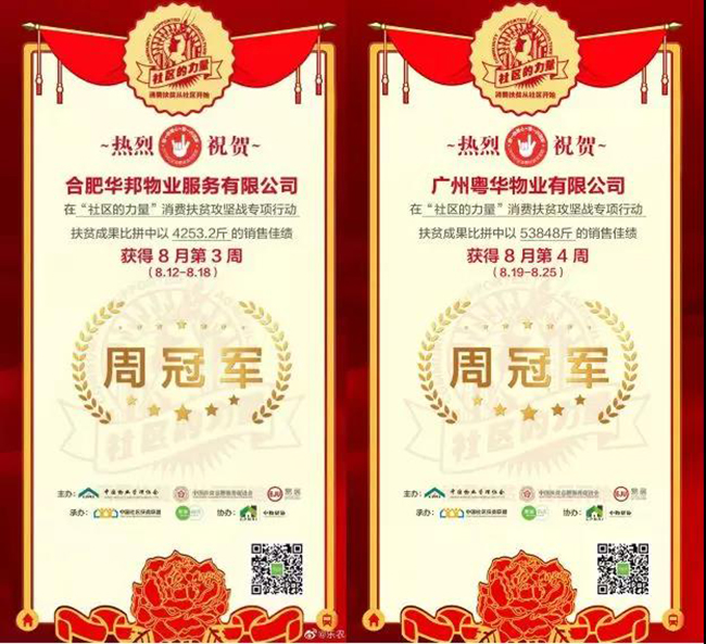 截止到目前,已经覆盖全国42个地方物业协会、近400家物业服务企业旗下近30000个社区参与其中,覆盖我国一二线城市高净值家庭超过3000万户。在社区的力量战报系统中,每一分每一秒,来自全国的社区订单都在刷新着我们的社区消费扶贫的纪录,销售额、销售斤数不断创造新高,826日,通过战报系统展示的客观数据,我们已经评选出一个月度冠军,8个周冠军。