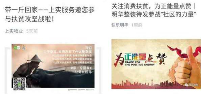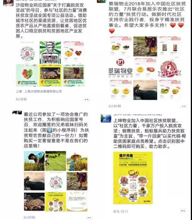 目前,各大物业服务企业纷纷开设线上专区、专铺,通过线下活动、广告动员、社群推广等线上线下相融合的手段,每天、每周、每月都在将“带一斤回家,消费扶贫从社区开始”的理念传递给每一位业主。