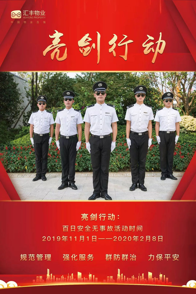 从2019年11月1日至2020年2月8日,汇丰物业开启了以“百日安全无事故”为主题的亮剑行动。成立专项小组进行安全防范宣传、与辖区派出所联动巡查、排查安全隐患、应急模拟训练等活动,更好的保障社区的安全,为每一位业主提供更为放心的社区生活空间。