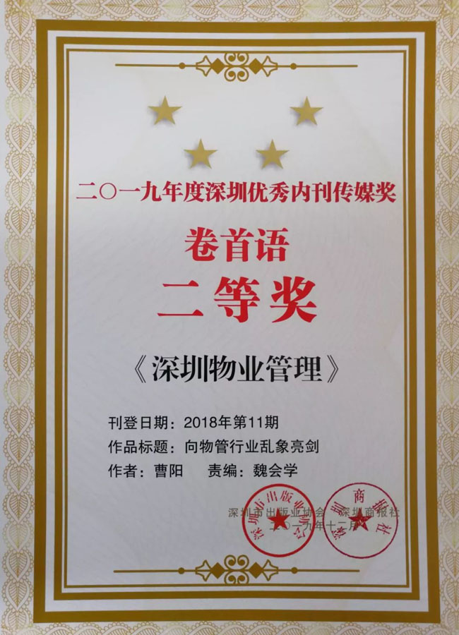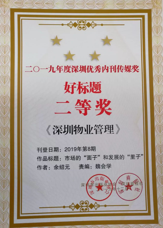 12月6日,2019深圳内刊界总结交流大会暨“优秀内刊传媒奖”表彰大会在北京召开,会上揭晓了2019年度深圳内刊界“优秀内刊传媒奖”评选结果:由深圳市物业管理行业协会编印的《深圳物业管理》获2019年度“优秀城市内刊奖”;曹阳会长撰写的卷首语《向物管行业乱象亮剑》在众多稿件中脱颖而出,获“优秀卷首语”二等奖;之平管理执行总裁余绍元撰写的《市场的“面子”和发展的“里子”》获“好标题”二等奖。今年的评选活动由深圳市出版业协会和深圳商报社联合举办,这也是深圳市物业管理行业协会《深圳物业管理》会刊连续九年获此荣誉。