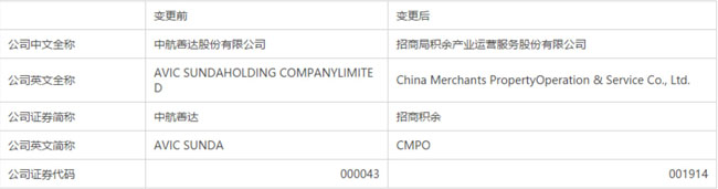 12月05日,中航善达发布公司名称工商变更登记完成的公告,公司名称由“中航善达股份有限公司”变更为“招商局积余产业运营服务股份有限公司”,证券代码拟由“000043”变更为“001914”。