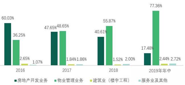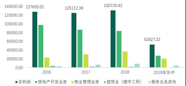 从中航善达的利润分布来看,随着房地产业务剥离,物业管理服务所占毛利率的比例有所上升。2018年底,中航善达的房地产业务依然占大头,物业管理服务仅有房地产业务的一半,至2019年中,中航善达的物业管理服务已经占据了主要利润来源,但对于物业领域来说,中航善达的整体盈利能力还待提升。