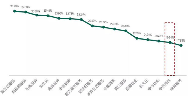 在已上市的20家企业毛利率情况来看,中航善达目前的业务毛利率仅有19.64%,这与其业态布局情况以及项目运营模式有关,中航物业主要服务政府、公建等重要场所,对于服务品质、设施设备的的专业管理能力要求较高,此特性要求企业的成本投入较大,所以致使整体毛利呈现较低的情况。